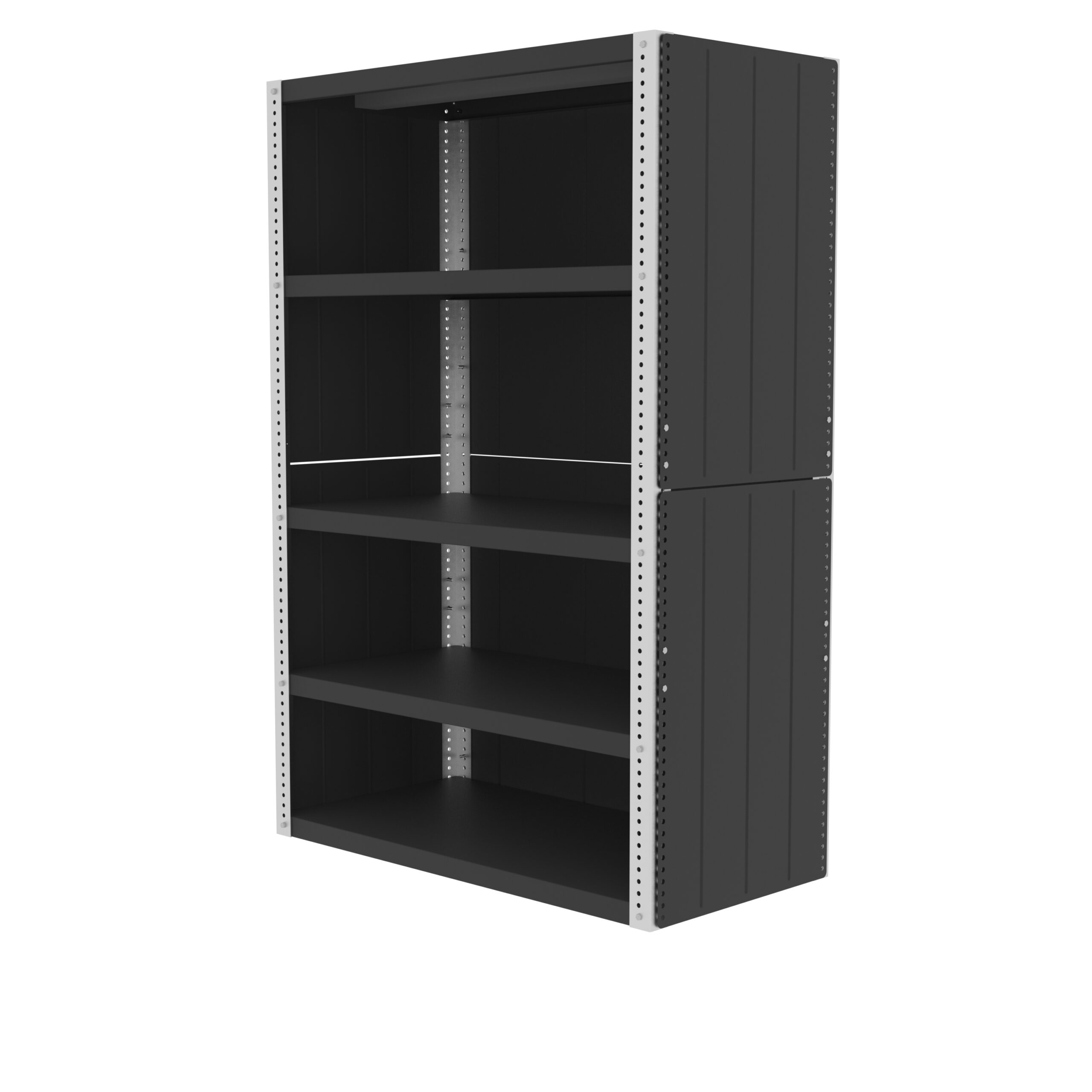 • (5) 24″ deep 12 gauge shelves included, easily adjustable on 1” increments.