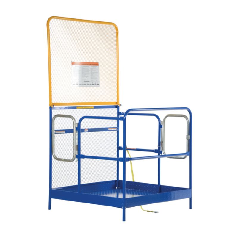 This Vestil WP-4848-84B-DD Steel Work Platform With 2 Door Entry quickly and safely raises maintenance personnel where they are needed. Attaches to fork truck by inserting forks into fork pockets and securing platform to fork truck. Fork locks secure platform to forks. Dual handrails on three (3) sides. Expanded metal backing on fourth side. Includes checker floor plate platform and long strap with hook to attach platform to fork truck. A maximum of two (2) people can be in the work platform at one time. Meets California OSHA specifications.